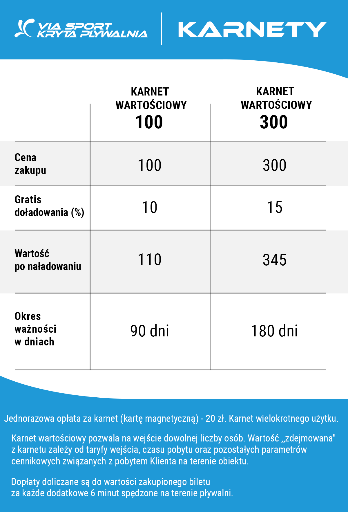 Zachęcamy do korzystania z możliwości zakupu karnetów kwotowych do Via Sport Kryta Pływalnia. W naszej ofercie znajdują się następujące opcje: